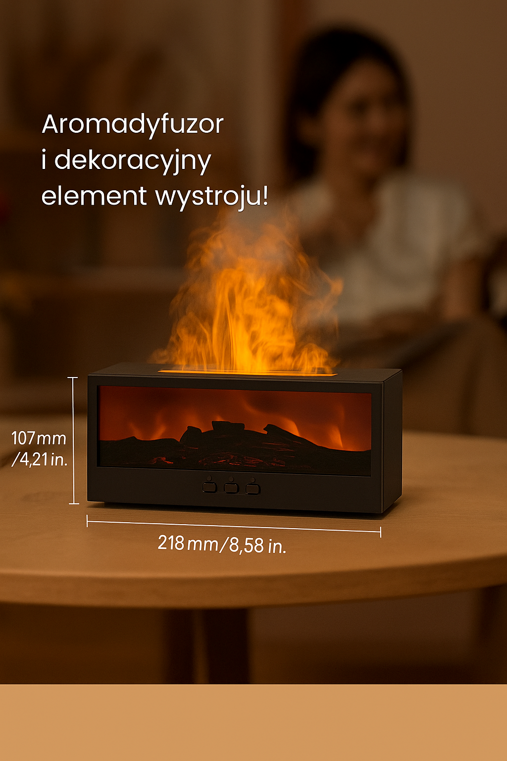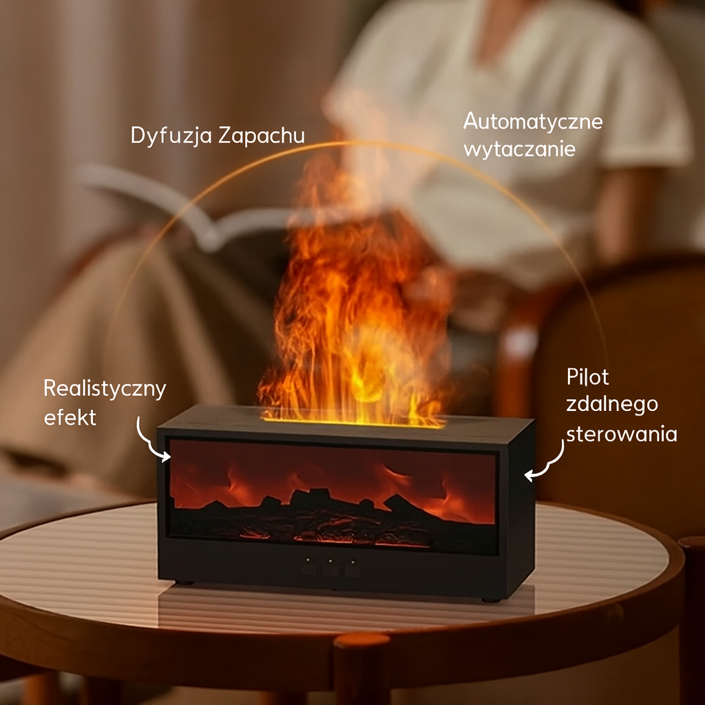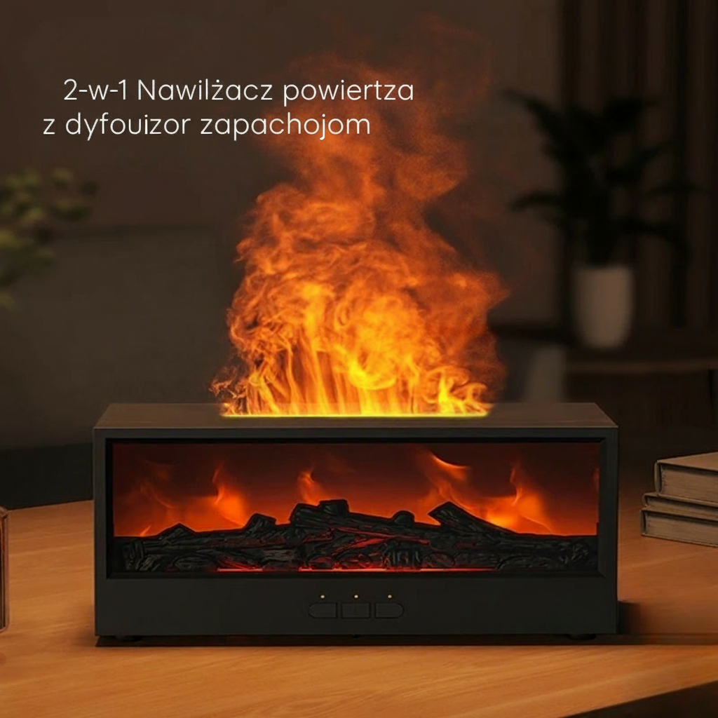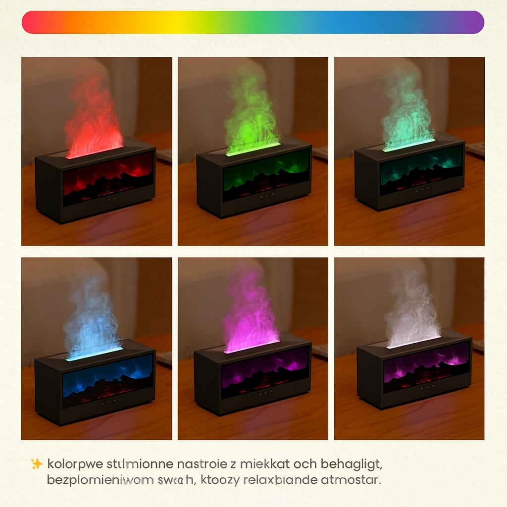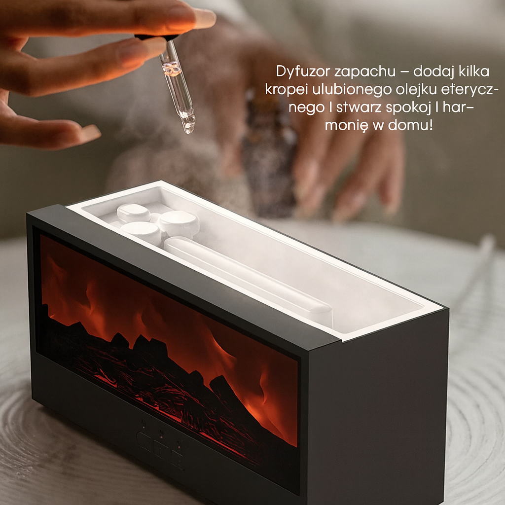 Znudziła Cię sucha atmosfera i stresujące wieczory? Nasz nawilżacz powietrza z dyfuzorem aromatów zapewni Ci wszystko, czego potrzebujesz, aby stworzyć relaksującą i ciepłą atmosferę. Rozpylają kojący zapach olejków eterycznych, przytulne nocne światło przypominające kominek oraz kolorowe LED, które tworzą wspaniały nastrój – wszystko łatwo sterowane pilotem.